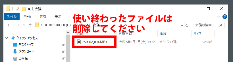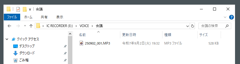 このデータ(今回は250902_001.MP3)をコンピュータにコピーしてください。