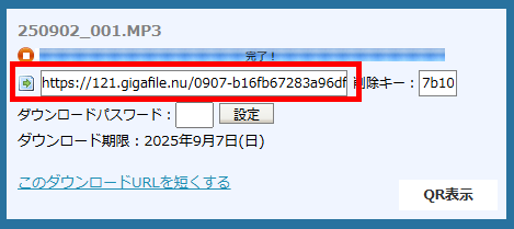 ファイルをアップロードすると、すぐ下に専用URLが発行されます。このURLをコピーし、相手へ伝えてください。