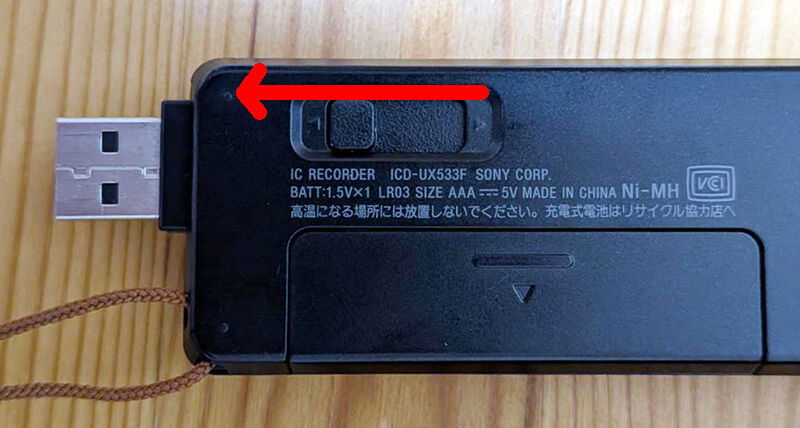 録音したデータは、パソコンに移すことができます。ICレコーダー裏面にあるスライドを動かすことで、USBの差込口が出てきます。このUSBをお使いのパソコンに差し込んでください。