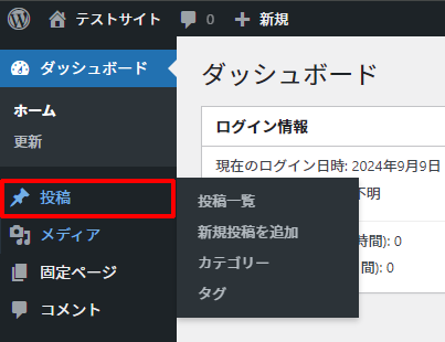 1. 左メニューから[投稿]をクリックします。