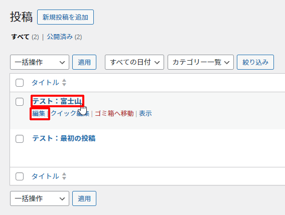 2. 投稿した記事の一覧画面が表示されます。修正したい記事のタイトルをクリックします。